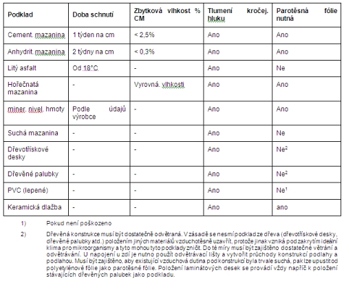 Podklad musí být rovný, pevný a absolutně nosný. Dbejte přitom také doporučení výrobce. Pokud podklad vyžaduje (viz tabulka nahoře) položení parotěsné fólie, pak to musí být polyetylénová fólie min. 0,2 mm silná. Tato fólie se pokládá s přesahem 20cm a spojuje se slepují. Jako izolace k tlumení kročejového hluku je vhodná pěnová polyetylénová fólie, žebrová lepenka, korek, dřevovláknité izolační desky a plsť.