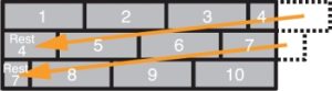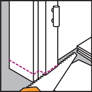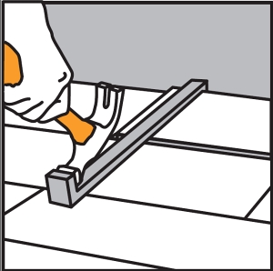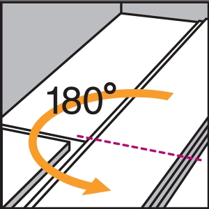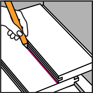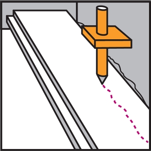 První deska se přiloží drážkou ke zdi. Nejlépe bude, když začnete v levém rohu místnosti. Pomocí distančních klínků se zajistí dilatační spáry cca 10-15 mm ode zdi. Zohledněte dilatační spáry 1,4 mm/m v místnostech delších než 7 m. Položte další desky nejprve ještě bez lepení. Poslední deska v řadě se otočí o 180° a potřebnou délku lze tak přesně označit. Desky řežte pilkou vždy ze strany s dekorem. Výjimka: U elektrických pilek se řeže z rubové strany, aby se zabránilo štípání hran. Zbytek desky první řady můžete nyní použit na začátek druhé řady, Aby se zachovalo stabilní spojení řad, měla by být napojení nejméně o 40 cm. Pro přesné vyrovnání používejte provázek. Pokud není stěna příliš rovná, označte si její tvar na desky jak je vidět na obrázku nahoře. Pak lze desky přesně podélně uříznout a upravit je tak podle tvaru stěny.