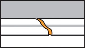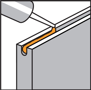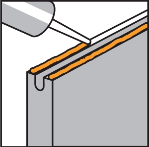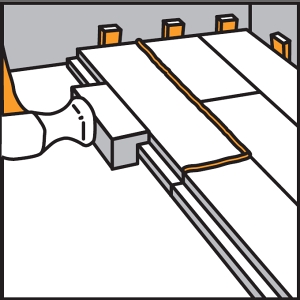Pokud jsou položeny první tři řady, lze začít s lepením.U laminátů na nosné desce HDF se lepidlo nanese na oba boky drážky na podélné a čelní straně. U laminátu na nosné desce z dřevotřísky se lepidlo nanáší do drážky na podélné a čelní straně. Pomocí kladívka a dřevěného špalíku se desky opatrně spojují. Při spojování desek musí lepidlo po celé délce spáry vystoupit ven. Lepidlo se nechá chvíli zaschnout a pak se odstraní plastovou stěrkou a vlhkým hadříkem.