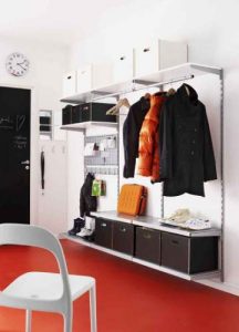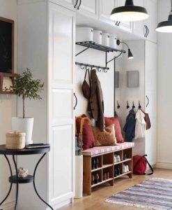 Proto bychom už při jejím plánování měli počítat s lavičkou nebo židlí, botníkem, závěsnými háčky na kabáty i klíče a odkládací poličkou. V prostorově omezené předsíni musíme využít ve svůj prospěch veškeré dispoziční nepravidelnosti, jako jsou výklenky, výstupky a niky budované pro měřiče. Poměrně dost místa ušetříme správnou volbou dveří – zasouvacími do kazet u pokojových dveří otevírajících se do předsíně a posuvnými u šatní skříně. Ta může sahat až do stropu, čímž získáme dostatek úložného prostoru – vejdou se do ní kabáty pověšené na šatní tyči a stejně tak i boty uložené v botních koších. V části u stropu pak své místo najde mimosezónní oblečení, sportovní potřeby a další ne příliš často používané věci.