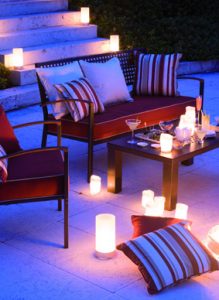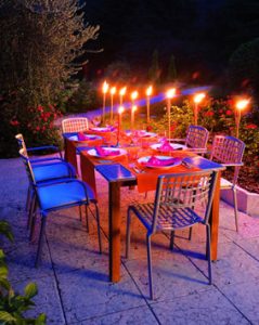 Růžové, oranžové, jablkově zelené, nebo tyrkysové ubrusy terasu dokonale rozzáří. Když k nim přidáme barevně sladěné papírové ubrousky, nádobí i svíčky, efekt bude dokonalý. Právě svíčky patří k nezbytným zahradním dekoracím dodávajících pomíjivost vzácného okamžiku. Navíc často zahánějí i nepříjemný hmyz, což v blízkosti jezírka můžeme ocenit. Mohou se stavět nejen na stůl, ale také podél cest či pověsit na stromy – pak by však měly být vždy v lahvích, aby nedošlo k požáru, navíc je vítr neuhasí.
